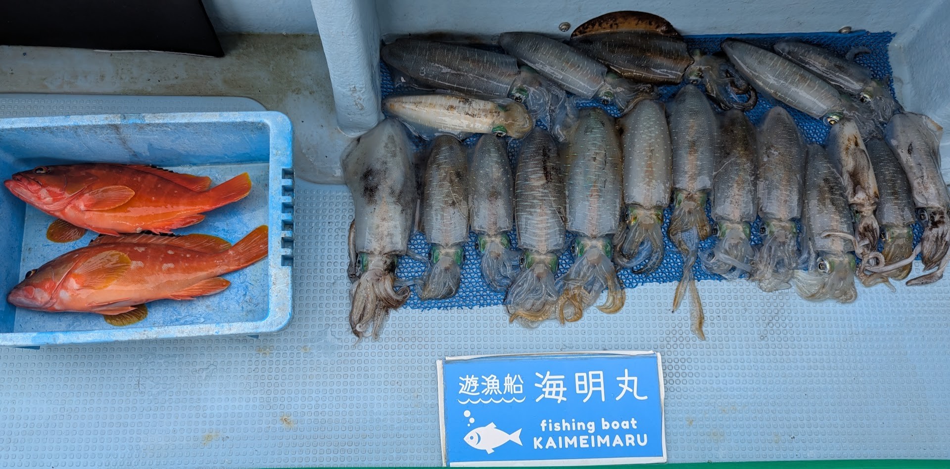 - オリジナルコースでティップランでの出船でした。朝からぽつぽつ釣れて全員安打😊中盤はなかなか厳しい感じ・・・後半はプチ時合で連続ヒットがあったりでイイ感じで終了でした。魚種はアオリイカ、アカハタなどでした。<div>今日はお疲れ様でした。またの乗船お待ちしております。</div>
