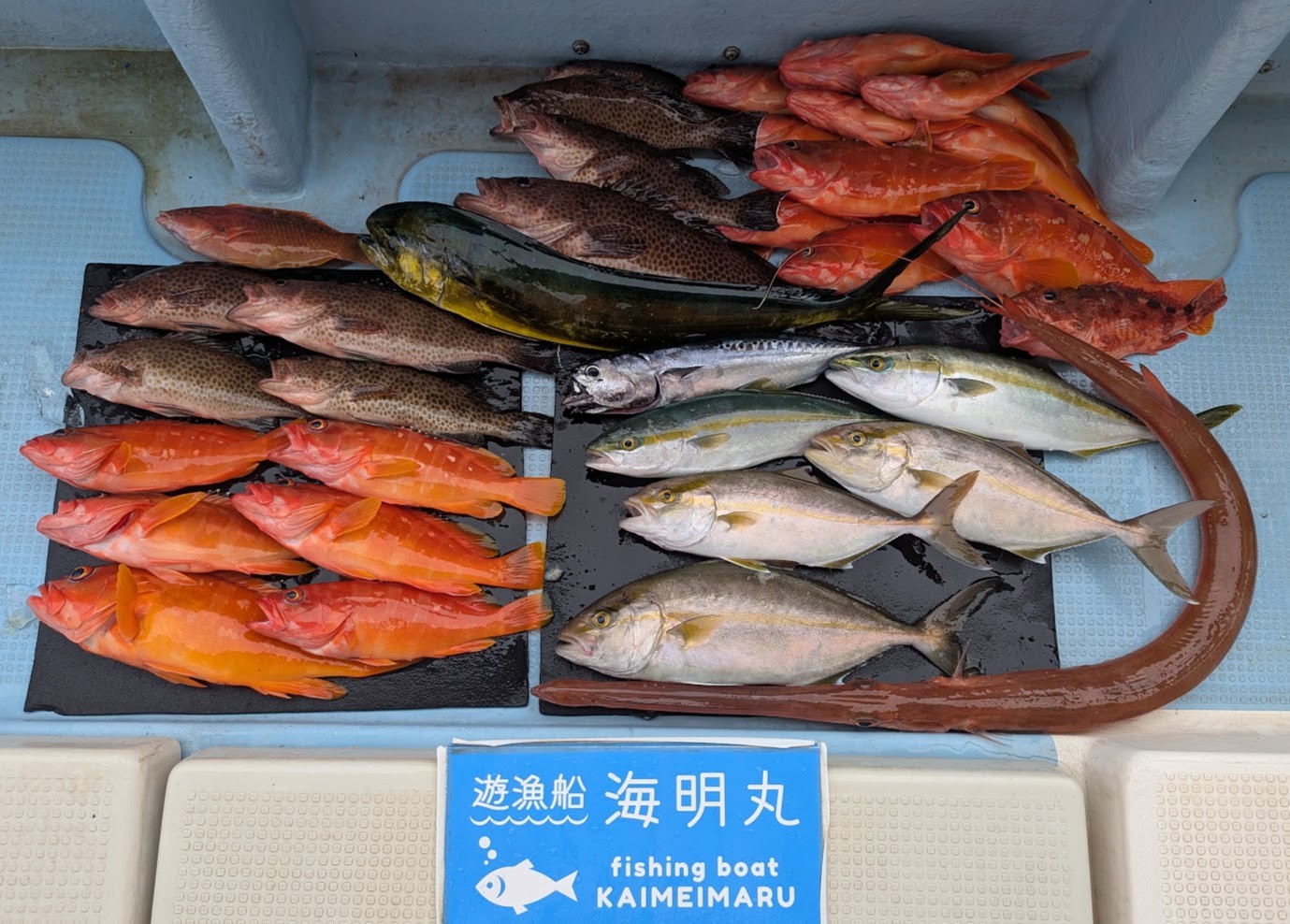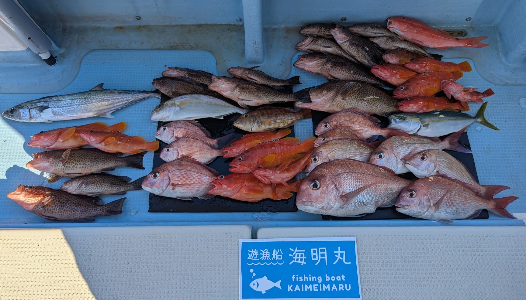 - 午前便でSLJでの出船でした。根魚中心にぽつぽつ釣れて・・・SLJ初挑戦の方たちもいましたが全員キャッチ😊<div>あと、フックアウト多数残念でした😢魚種はツバス、アカハタ、オオモンハタ、アヤメカサゴ、オジサン、レンコダイ、ホウボウなどでした。</div><div>今日はお疲れ様でした。またの乗船お待ちしております。</div>