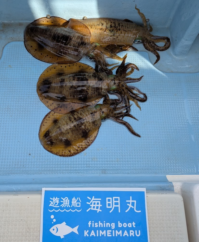 - オリジナルコースでティップランでの出船でした。一日中厳しい状況でしたが、ポイント移動しながら何とかアオリイカ、キャッチしていただきました。釣れれば平均、サイズはいい感じで大きいのは1.4㎏ほどありました。<div>あと、おさわりだけで乗らない当たりがあったりで残念でした。</div><div>今日はお疲れ様でした。またの乗船お待ちしております。</div>
