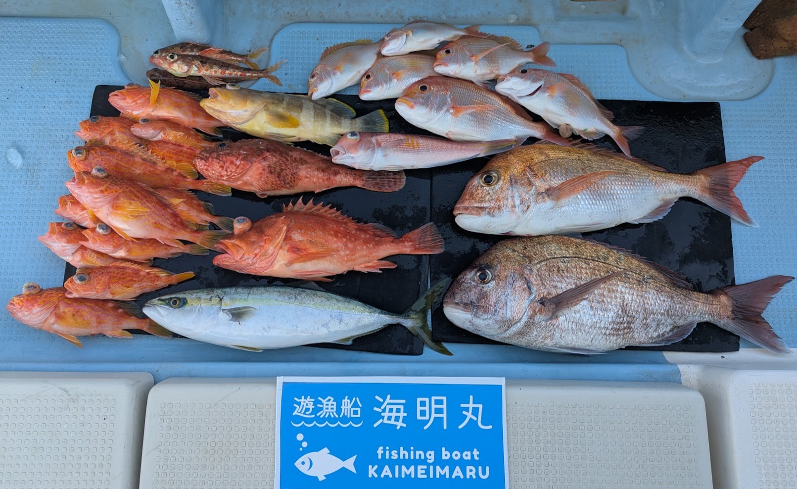 - 午前便でエサ五目釣りでの出船でした。深場で初挑戦していただき、前半からぽつぽつ釣れてイイ感じ😊アマダイは40オーバーも釣れたりで😊エサ取りも元気でした。ラストまで当たりがあり、いい感じで終了でした。魚種はアマダイ、レンコダイ、ホウボウ、ウッカリカサゴ、アヤメカサゴなどでした。<div><div>今日はお疲れ様でした。またの乗船お待ちしております。</div></div>