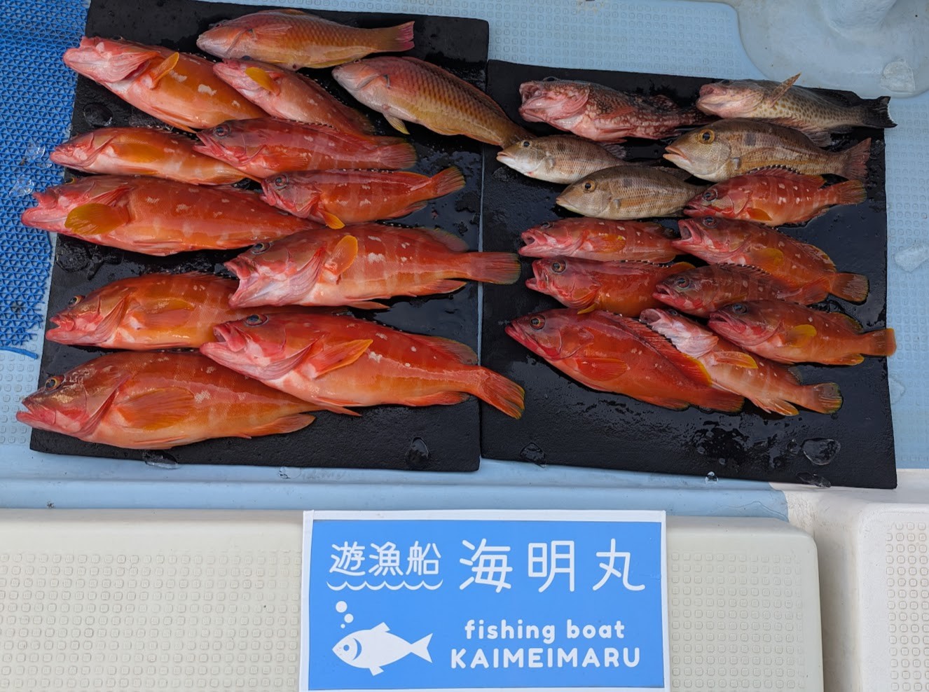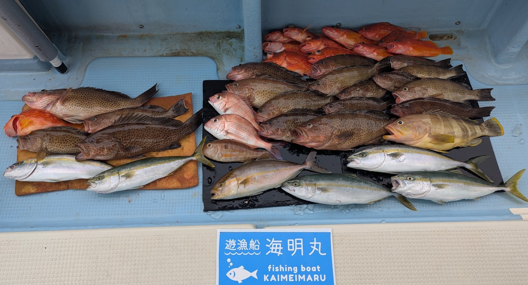 - タイラバ、SLJ、エサ五目釣りなど、何でも便での出船でした。朝から風でしたので、風の楽なポイントで挑戦していただきました。色々な釣り方をしてもらいましたが、エサ五目釣で根魚中心にぽつぽつ釣れて終了でした。小さめの魚はリリースありがとうございます。魚種はアカハタ、オオモンハタ、カサゴ、イトフエフキ、ササノハベラなどでした。<div>今日はお疲れ様でした。またの乗船お待ちしております。</div>