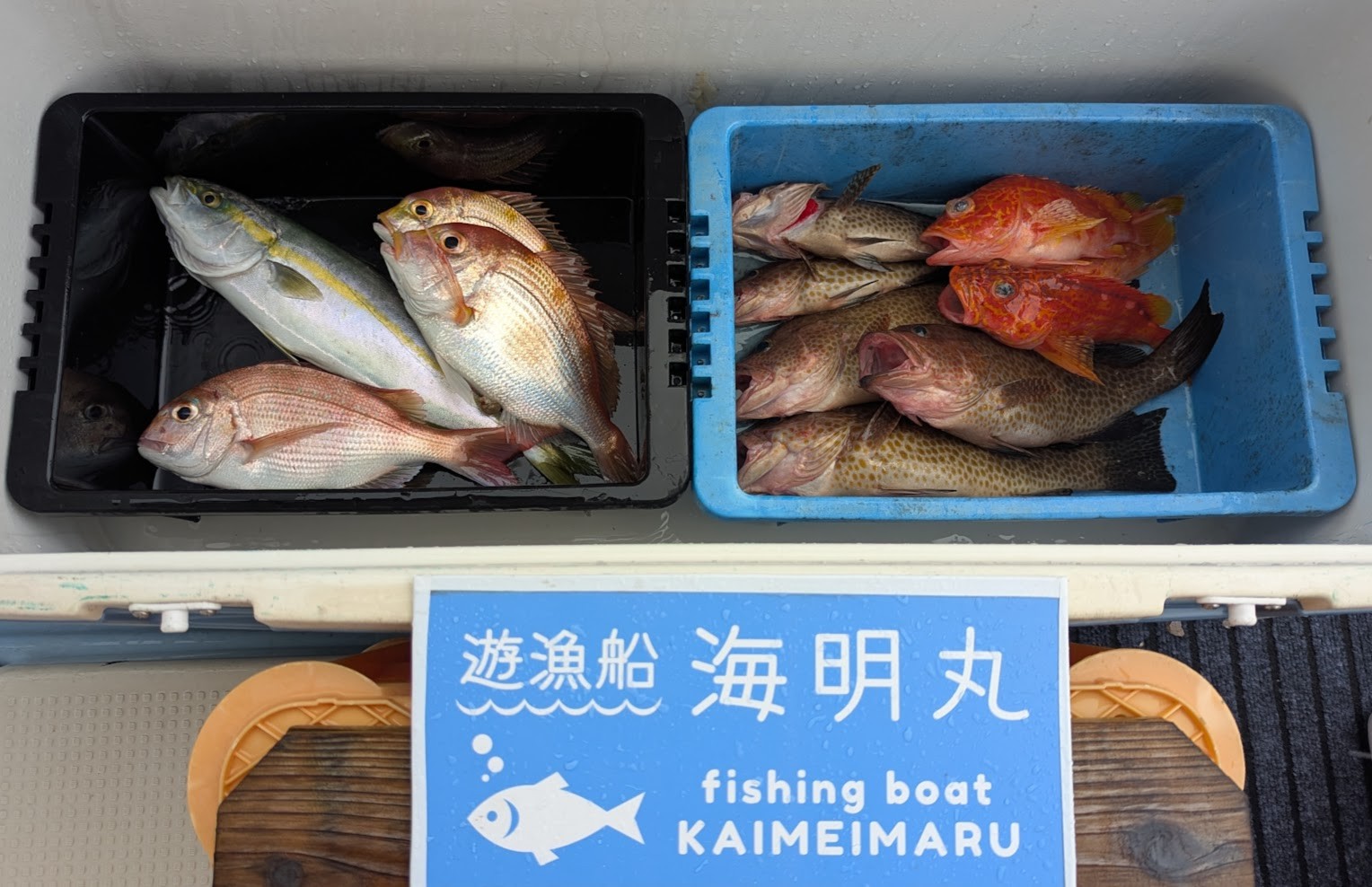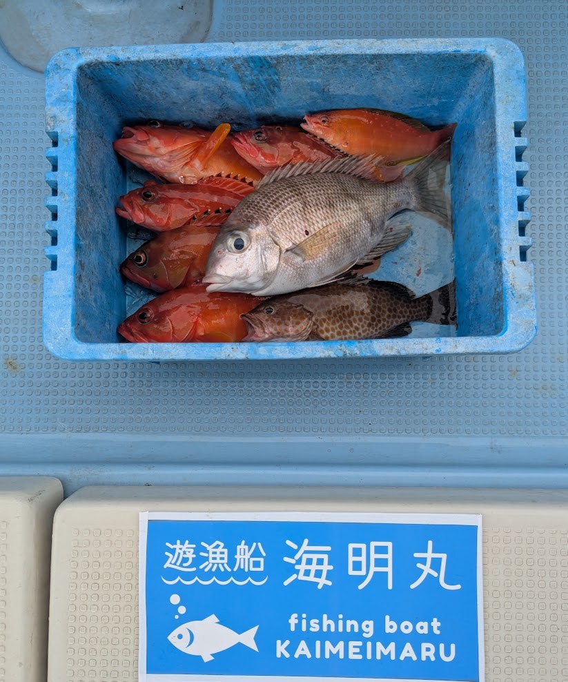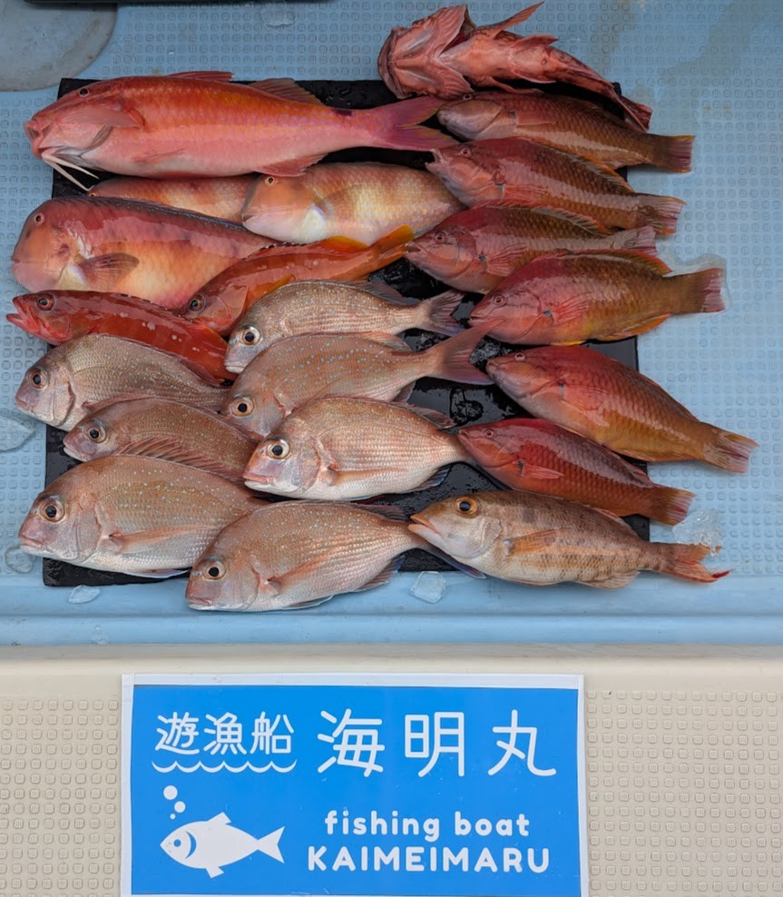 - 午前便でエサ五目釣りでの出船でした。朝から風でしたので、風裏限定で挑戦していただきました。<div>船釣り初挑戦方たちでしたが、ぽつぽつ釣れて全員釣っていただきました😊今日一の魚はラインブレイクで残念でした😢</div><div>魚種はマダイ、アカハタ、カサゴ、ササノベラ、オジサン、テス、イトフエフキなどでした。</div><div>今日は風の中お疲れ様でした。</div>