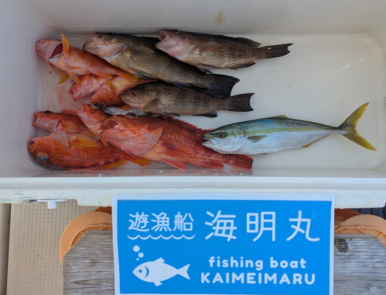 - オリジナルコースでライトジギング、タイラバ、他便での出船でした。朝一は深場でいきなりワラサ😊でしたが、後が今一つカサゴ、チカメキントキ・・・ポイントを少し浅場にしたらダブルヒットよく引いたのはブリ、続いて食べごろサイズのマダイ・・・後半少しティップラン、ジグで浅場のポイントで挑戦していただきましたが、アオリイカは配当なし😢<div>ジグではオオモンハタ、アカハタ、オジサンなどがぽつぽつ釣れて、食べる分だけキープしてあとはリリースありがとうございます。魚種はブリ、ワラサ、マダイ、チカメキントキ、オオモンハタ、ウッカリカサゴ、アヤメカサゴ、オジサン、ゴマサバなどでした。</div><div>今日はお疲れ様でした。またの乗船お待ちしております。</div>