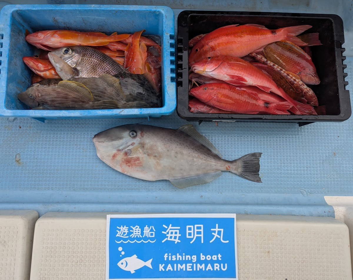- タイラバ便での出船でした。朝一はイマイチな感じでしたが、その後はぽつぽつ釣れてイイ感じ😊お父さんとお子さんのご家族2名たちは、お子さんがタイラバ初挑戦でしたが、オオモンハタ、カサゴ、ハマチ、ホウボウ、メイチダイなど色々釣っていただきました。お父さんはマダイもゲット😊常連さんは40オーバーのアオハタ、食べごろサイズのマダイ、シオ、ツバス、ホウボウなど色々釣れたので良かったです。フックアウト多数、ラインブレイクありで残念でした😢魚種はシオ、ツバス、マダイ、メイチダイ、オオモンハタ、アオハタ、ホウボウ、オジサン、イラ、アヤメカサゴ、アカヤガラなどでした。<div>今日はお疲れ様でした。またの乗船お待ちしております。<br><div><div><div><br></div></div></div></div>
