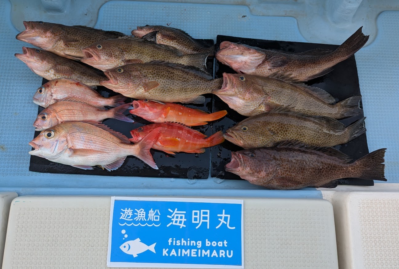 - タイラバ、ライトジギング、ティップランでの出船でした。<div>朝一はティップランを少し挑戦していただきましたが、イマイチでしたので、タイラバ、ライトジギングで頑張っていただきました。今日はデカオオモンハタ祭り😊重量感たっぷり・・・マダイは小さめで食べごろサイズでした。</div><div>魚種はマダイ、オオモンハタアカハタなどでした。</div><div>今日はお疲れ様でした。</div><div>またの乗船お待ちしております。</div>