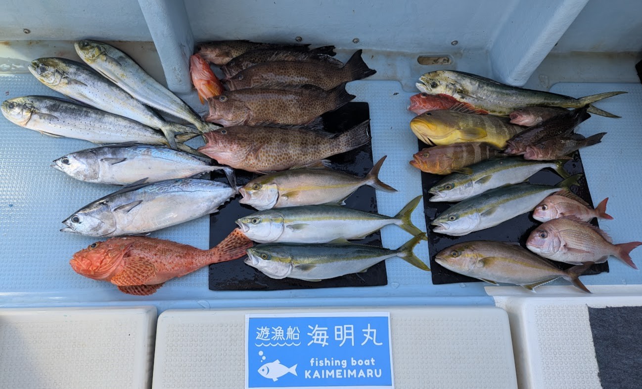 - SLJでお父さん、お子さんのグループで挑戦していただきました。朝からぽつぽつ釣れてイイ感じ😊初挑戦のお子さん釣っていただきました😊オオモンハタがよく当たり、40オーバーのナイスサイズもありました。釣れにくい時間帯もありましたが、最後まで頑張っていただいて全員安打で良かったです。あと、フックアウト多数で残念でした😢魚種はツバス、シイラ、オオモンハタ、アカハタ、ホウボウ、オジサン、アヤメカサゴなど<div>今日はお疲れ様でした。またの乗船お待ちしております。</div>