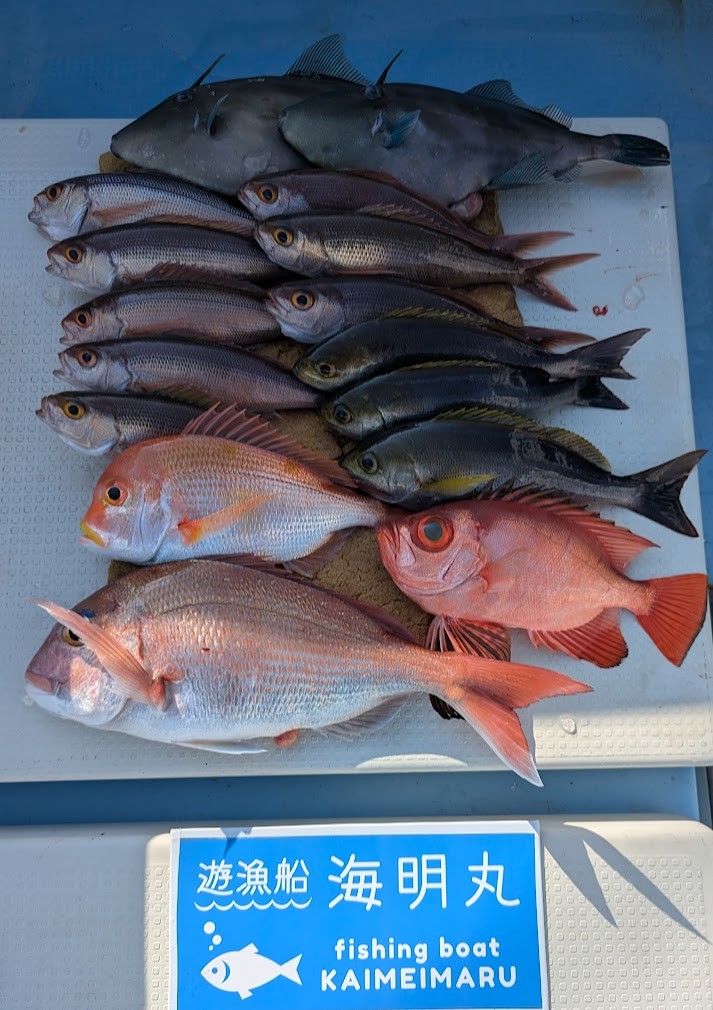 - エサ五目便での出船でした。浅場~深場とポイント移動しながら頑張っていただき、色々釣っていただきました。<div>釣れにくい時間帯もありましたが、最後まで楽しんでいただきました。魚種はアマダイ、レンコダイ、クルマダイ、メイチダイ、アカハタ、オジサン、ササノハベラ、イトフエフキ、カワハギ、カサゴ、アヤメカサゴなどでした。</div><div>今日はお疲れ様でした。またの乗船お待ちしております。</div>