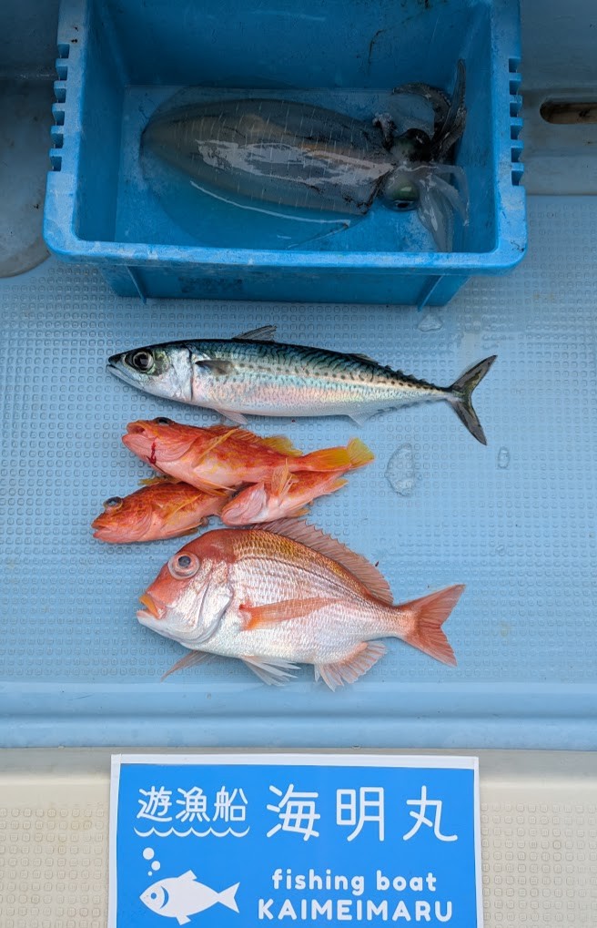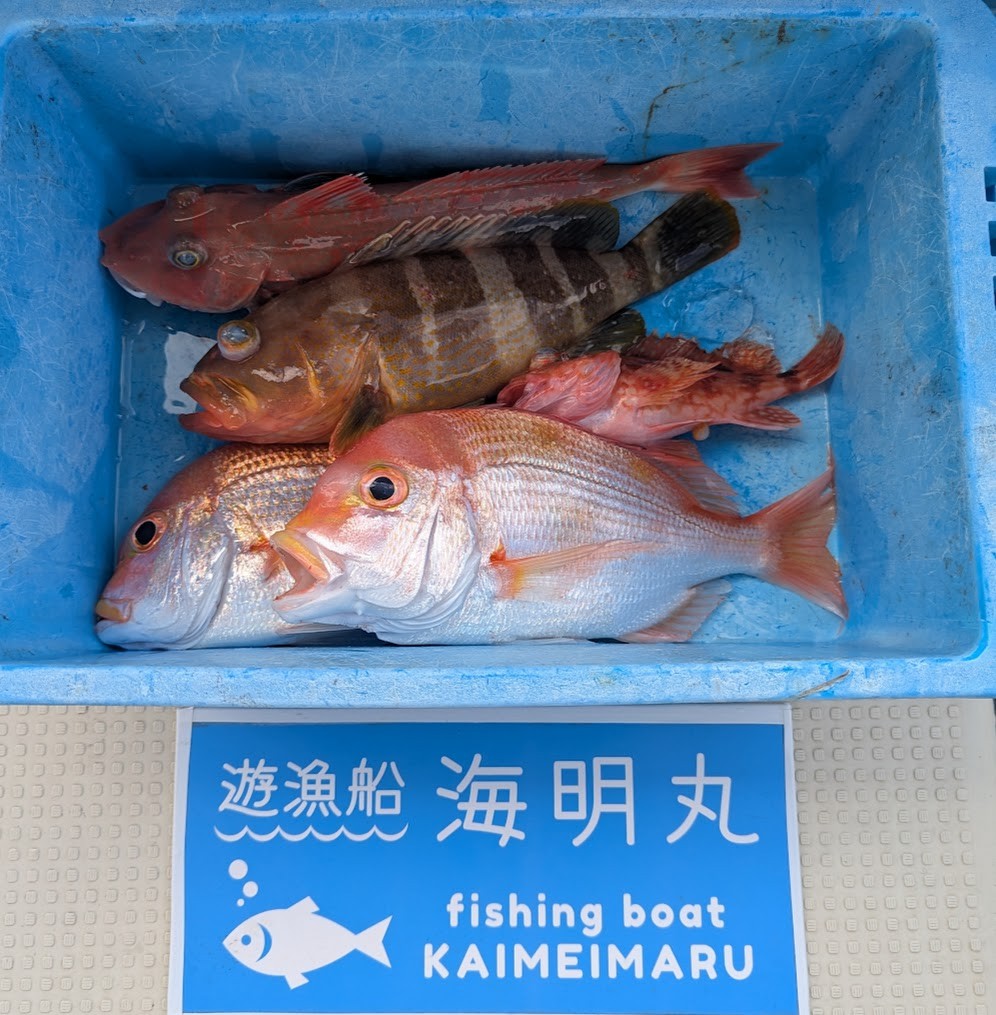 - 半日コース午前、午後でタイラバ、エサ五目便での出船でした。午前はぽつぽつ釣れてアマダイなどキャッチできましたが、午後からはなかなか渋い感じ😢ポイント移動しながら頑張っていただきましたが、ほぼカサゴだけで終了でした。<div>魚種はアマダイ、レンコダイ、イトヨリダイ、チカメキントキ、ウッカリカサゴ、アヤメカサゴ、タマガシラ、ヒメなどでした。</div><div>今日はお疲れ様でした。またの乗船お待ちしております。</div>
